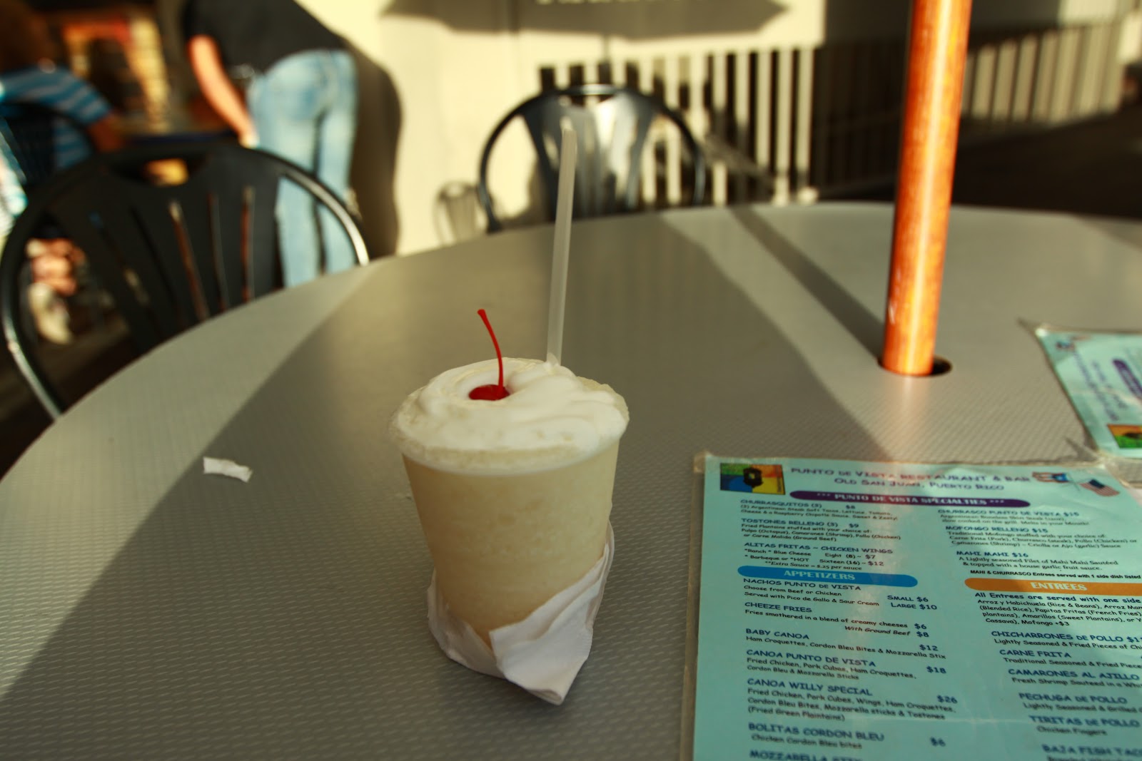 除了必點的Mofongo之外(點了蝦子口味好好吃~~), 還點了一個烤豬肉和一個當地啤酒, 少爺說喝起來很像台啤金牌, 我點的pina colada酒精味太重不合我的口味。Mofongo是一種炸的澱粉類食物, 我覺得有一點像番薯可是網路上說好像是香蕉?? 旁邊的醬汁味道像青醬很好吃!! 烤豬肉香味很誘人,有點難咬但是不減我們的興致, 美景當前甚麼都OK, 坐在外面享受金黃色的夕陽就值回票價了, 我們點這樣一人$21, 大體上食物中等可是價錢便宜就當享受氣氛囉!~吃完還可以去舊街上散散步, 隨地都是風景:D
