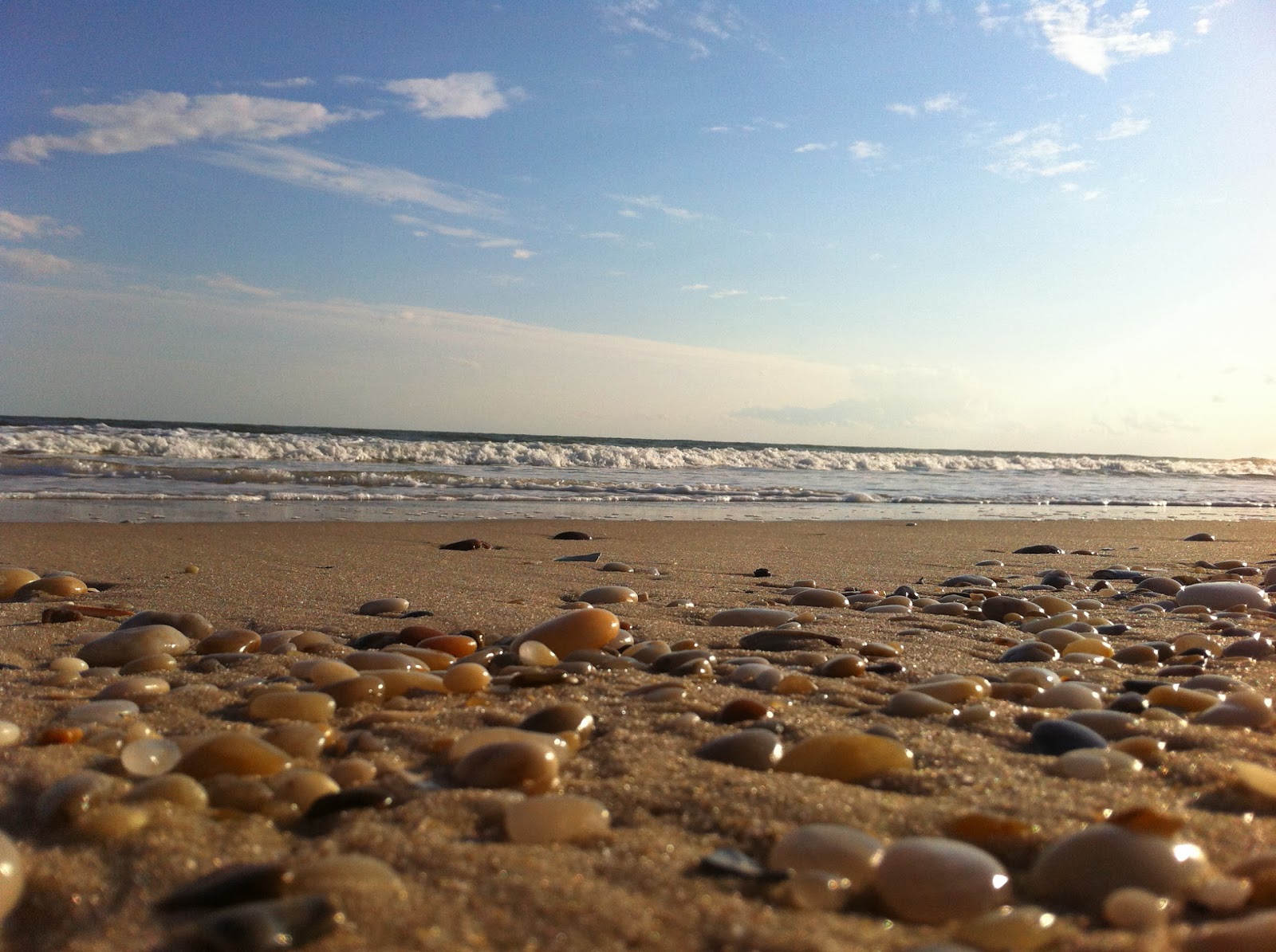 夕陽映得海面泛著金黃色的光 沾著水氣的石頭也在閃閃發亮